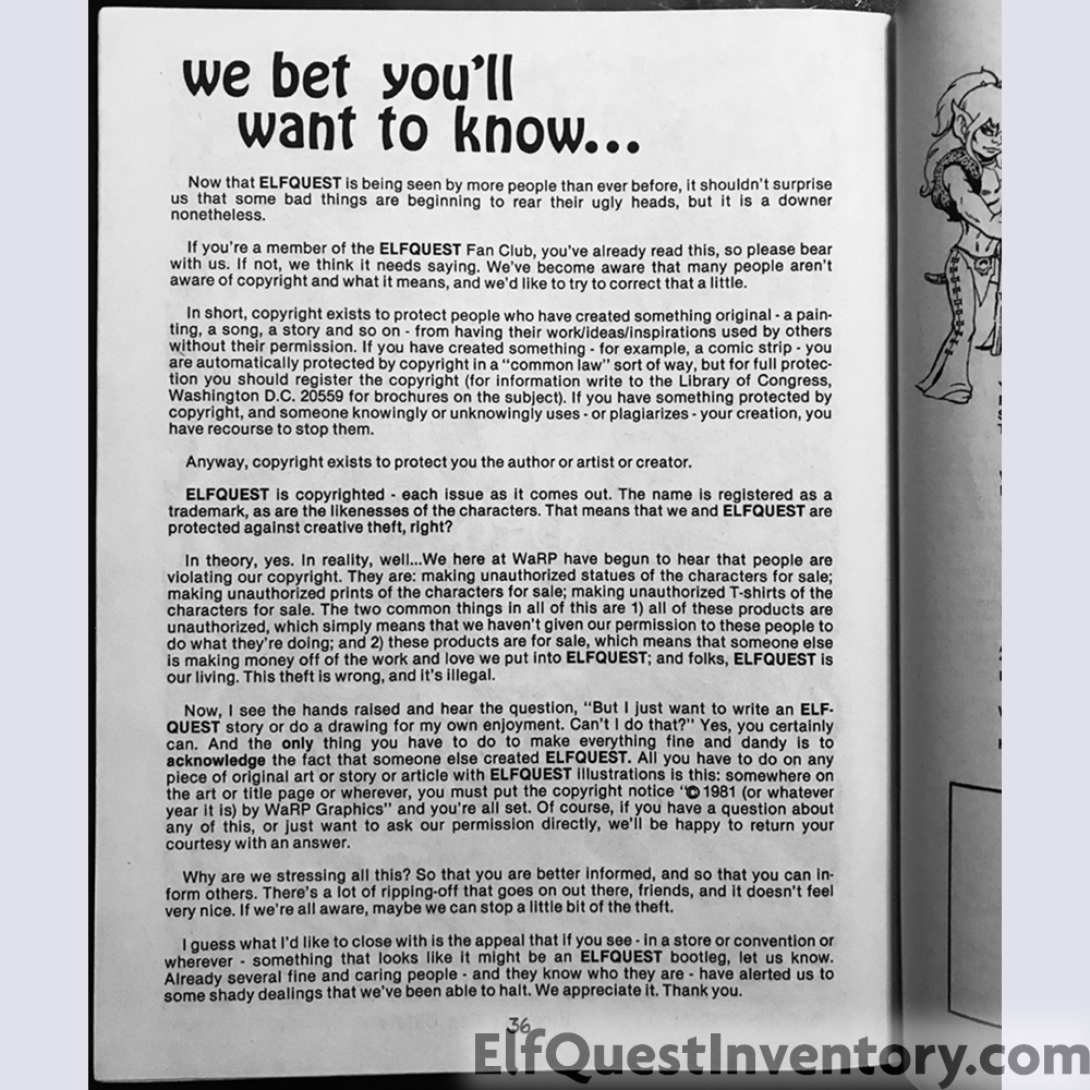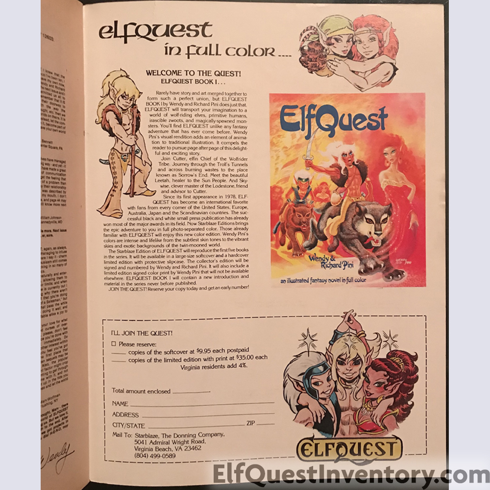 Back cover color illustration of Redlance and Nightfall, also found in all three versions of Portfolio III. Additional material: list of conventions the Pinis planned to attend, reprint of the cover and second plate of the first Portfolio by Schanes & Schanes, Fan Club information, ads for the first ElfQuest Gatherum printed by Fantagraphics, The Three Spirits of Life limited edition prints, letters, and an add for the Donning Starblaze edition in both softcover and limited edition hardcover with slipcase. |