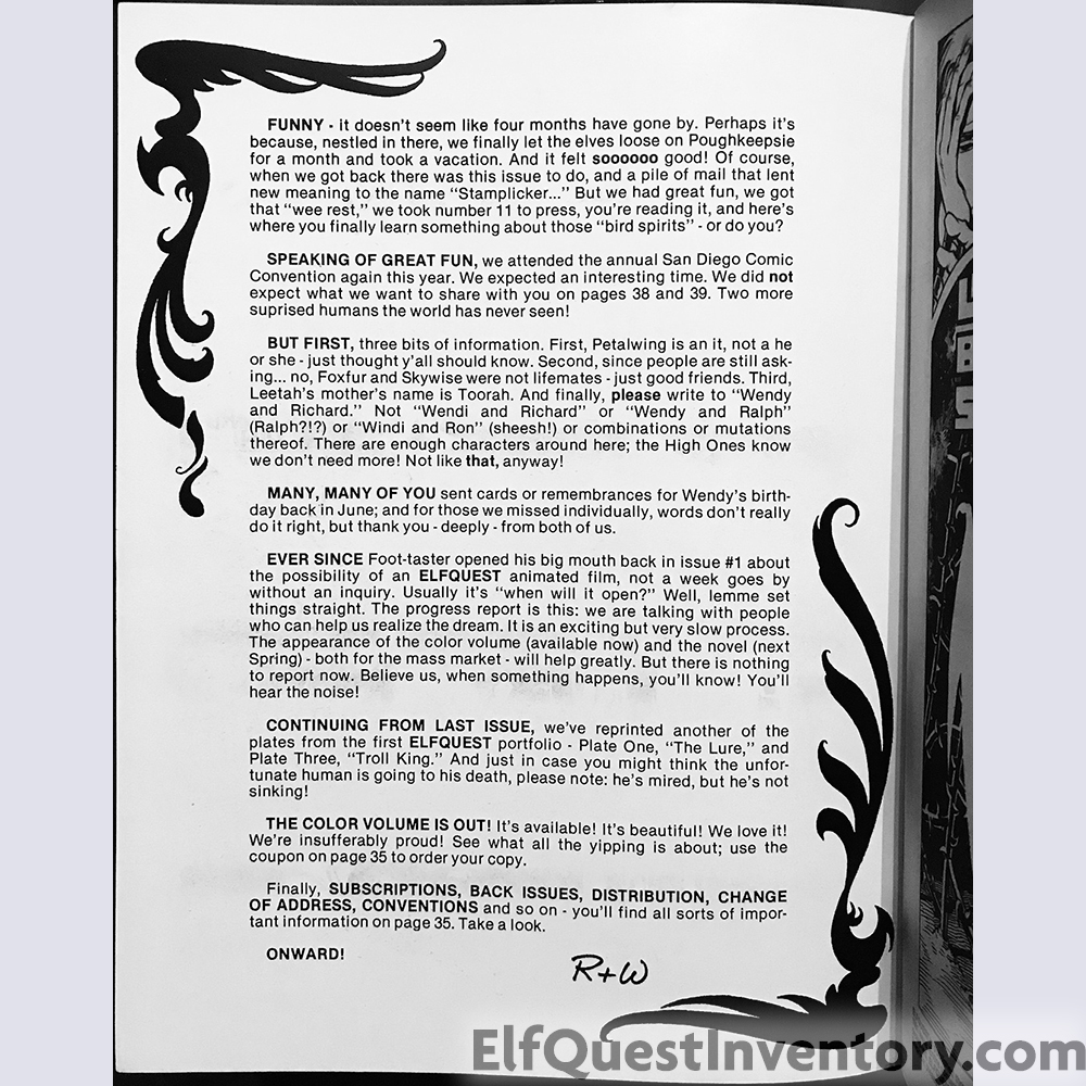 Back cover color illustration of Strongbow and Moonshade, also found in all three versions of Portfolio III. Additional material: letters, ad for the screen printed version of the Trio shirt, ad for the Starblaze softcover book one (hardcover limited has a line though it so must have sold out at that point), reprint of the first and third plate of the first Portfolio by Schanes & Schanes, A Day in the Lives featuring photos from the 1981 San Diego Comic Con, ads for the first ElfQuest Gatherum printed by Fantagraphics, and The Three Spirits of Life limited edition prints. |