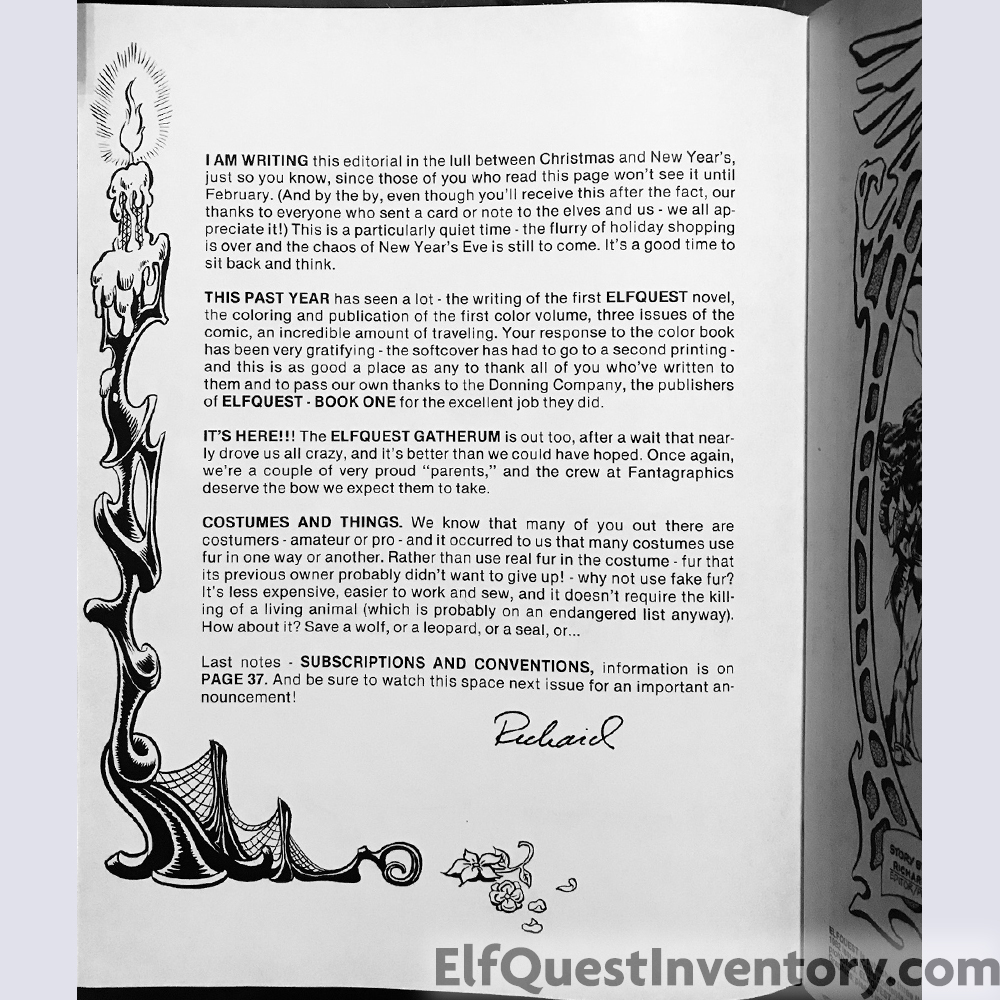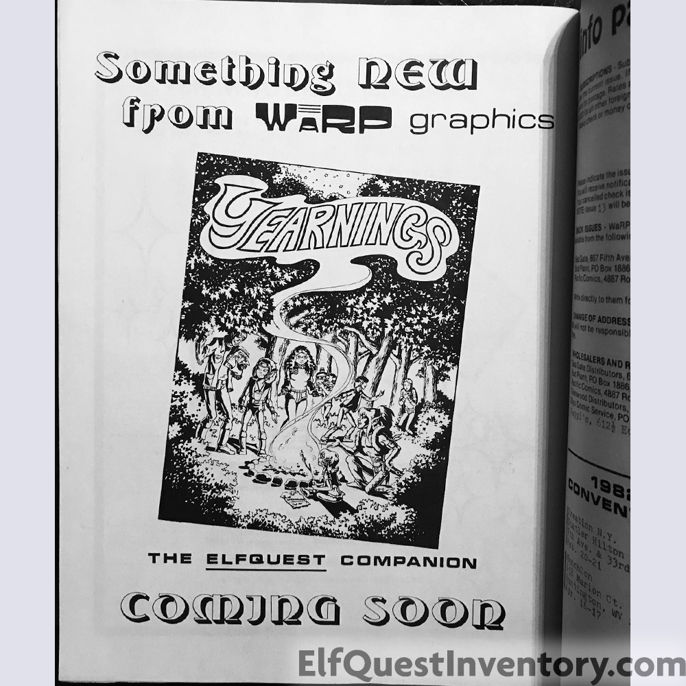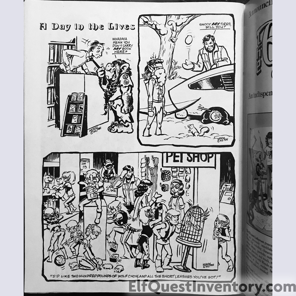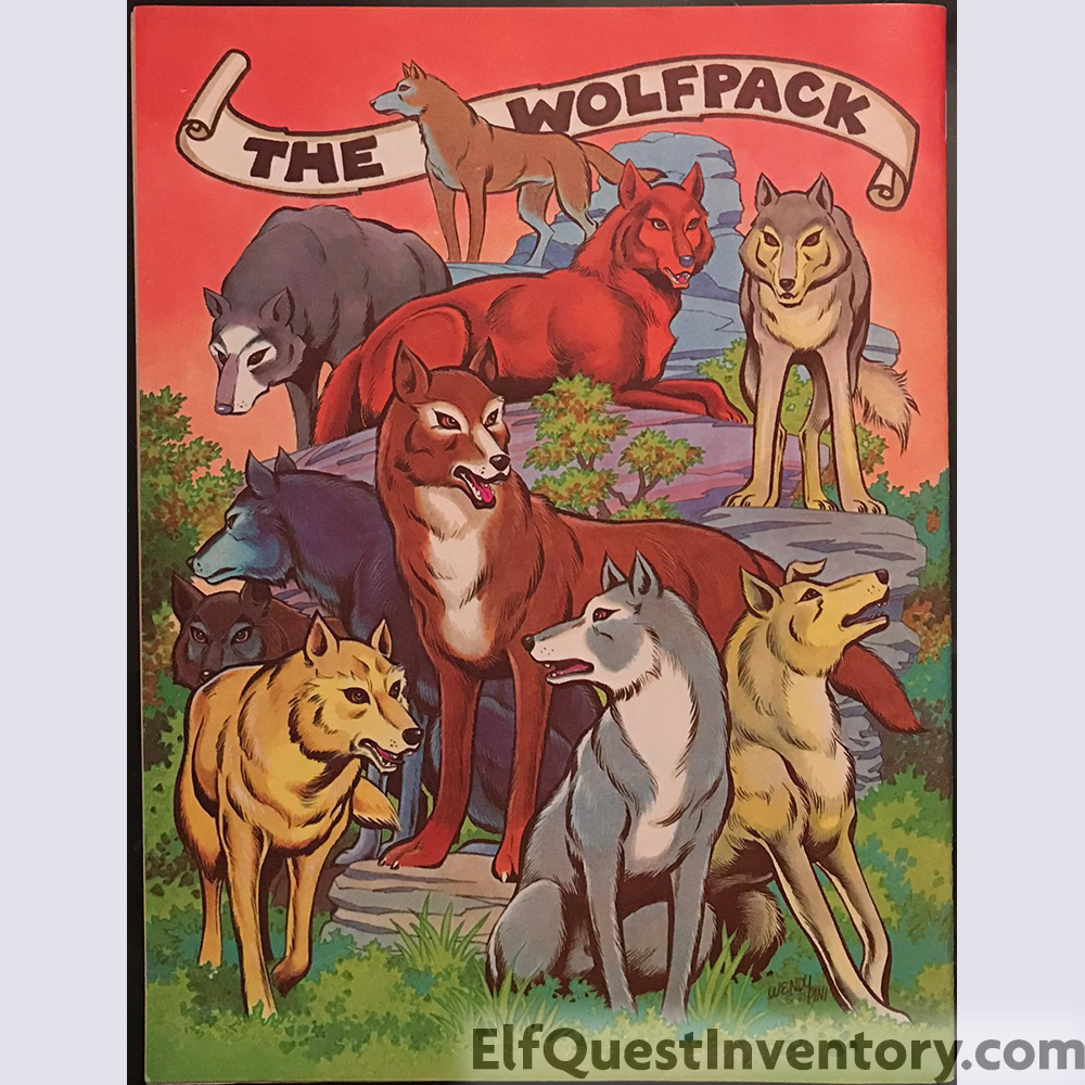 Back cover color illustration of the Wolfpack, also found in all three versions of Portfolio III. Additional material: list of conventions the Pinis planned to attend, A Day in the Lives with new comics by Wendy Pini, ad for the first Yearnings collection, Fan Club information, screen printed trio shirt, ad for the first ElfQuest Gatherum printed by Fantagraphics, The Three Spirits of Life limited edition prints, letters, and an add for the Donning Starblaze softcover edition. |