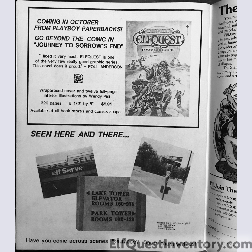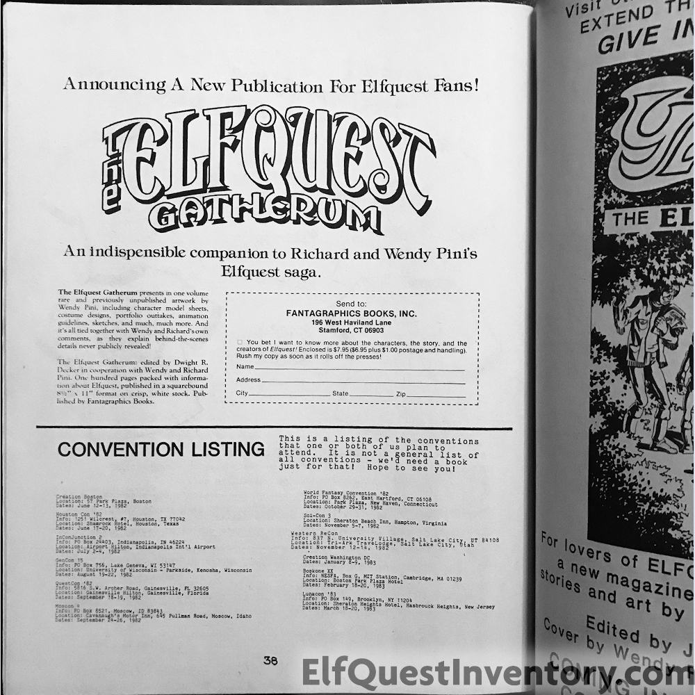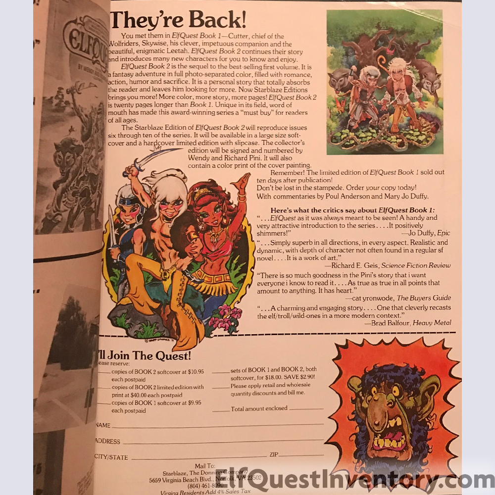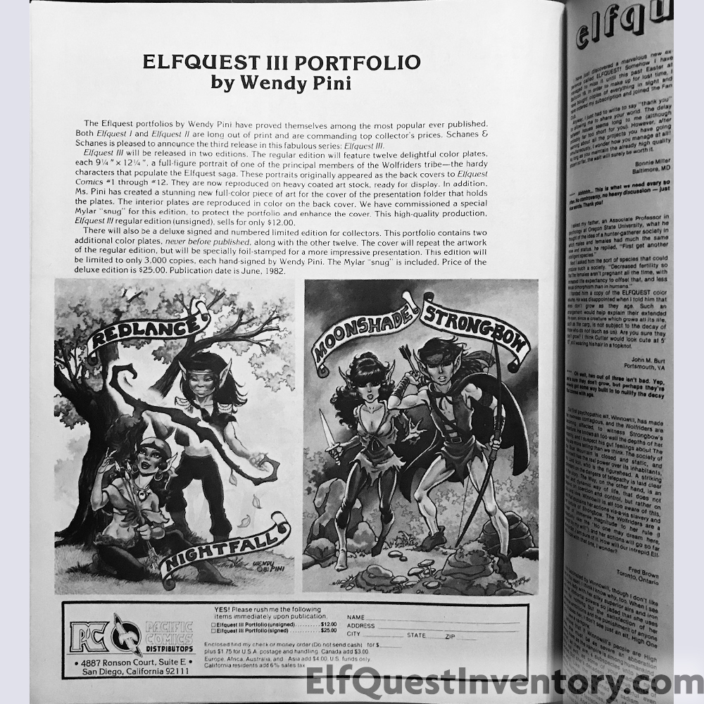 Additional material: Elfquest III portofolio announcement available in both limited and unlimited editions, ad for the four new shirts (Cutter, Picknose and two Nightfall designs) printed by Tony the T, A Day in the Lives, ad for the ElfQuest rollplaying game by Chaosium Inc, list of conventions the Pinis planned to attend, ad for Yearnings, letters, and an add for the Donning Starblaze book 2 in both softcover and limited edition hardcover with slipcase.
