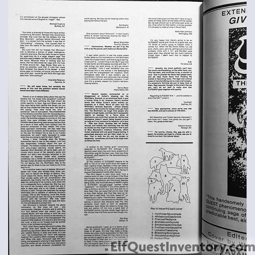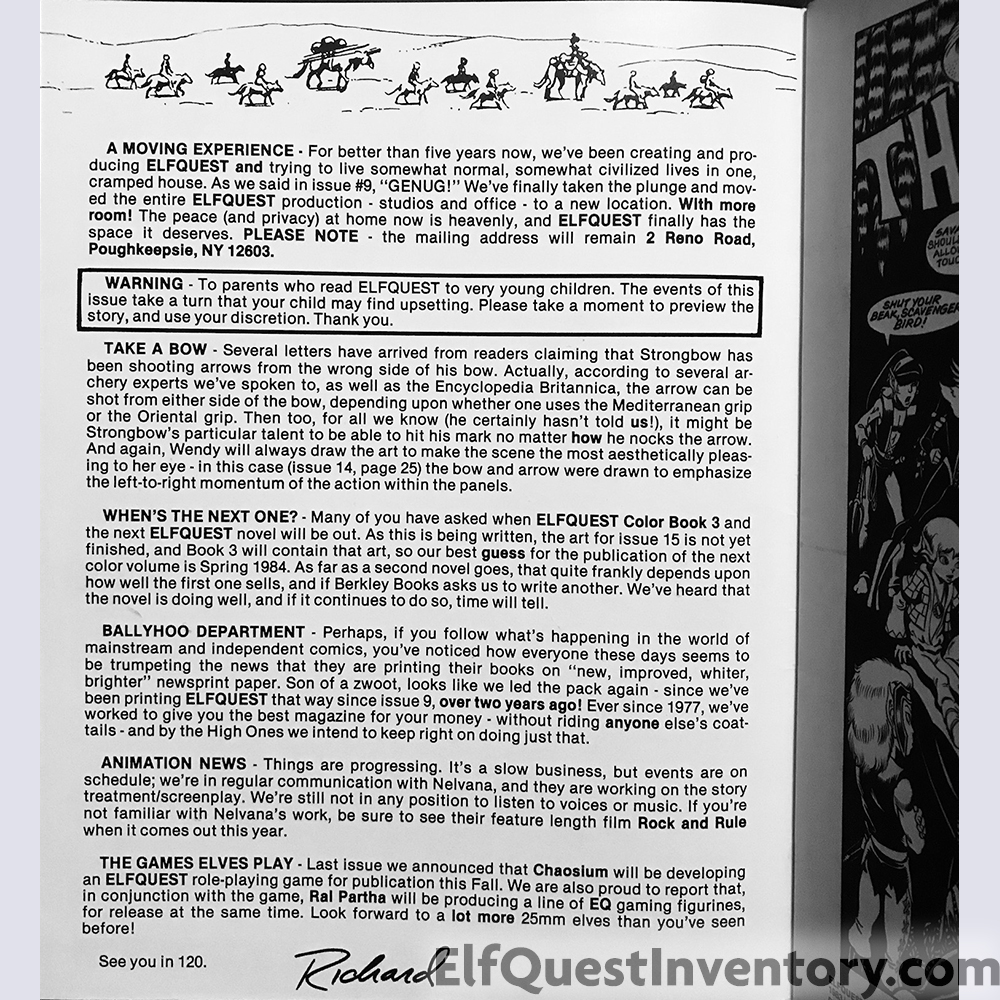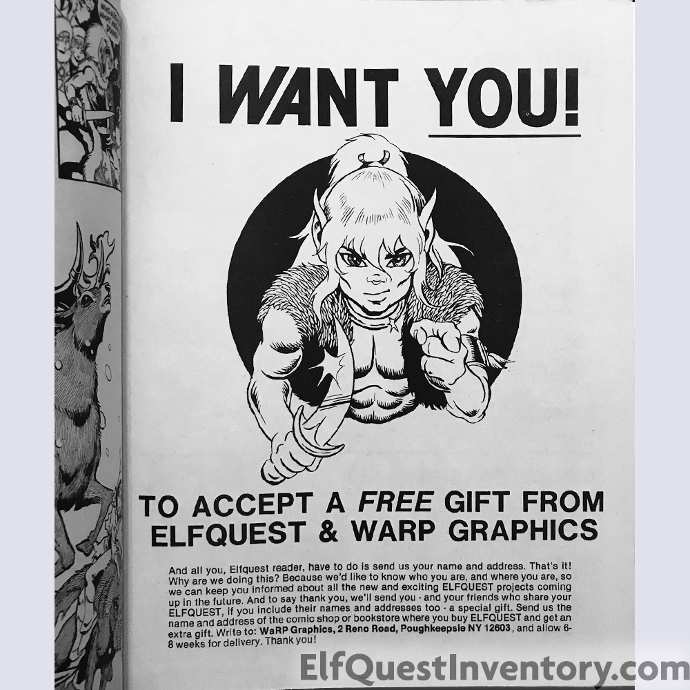 Free gift from ElfQuest and WaRP Graphics,list of conventions the Pinis planned to attend, reprints of plates 4 and 5 from the first Portfolio by Schanes & Shanes, letters, ad for Yearnings, key to the Wolfpack illustration from the back of issue 12,