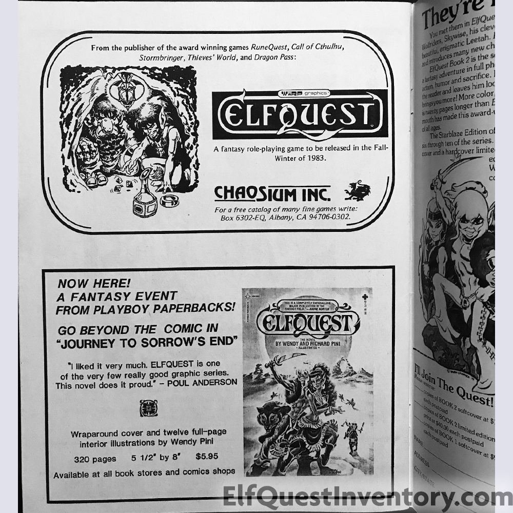 ad for the ElfQuest rollplaying game by Chaosium Inc, an add for the Donning Starblaze book 2 in both softcover and limited edition hardcover with slipcase.