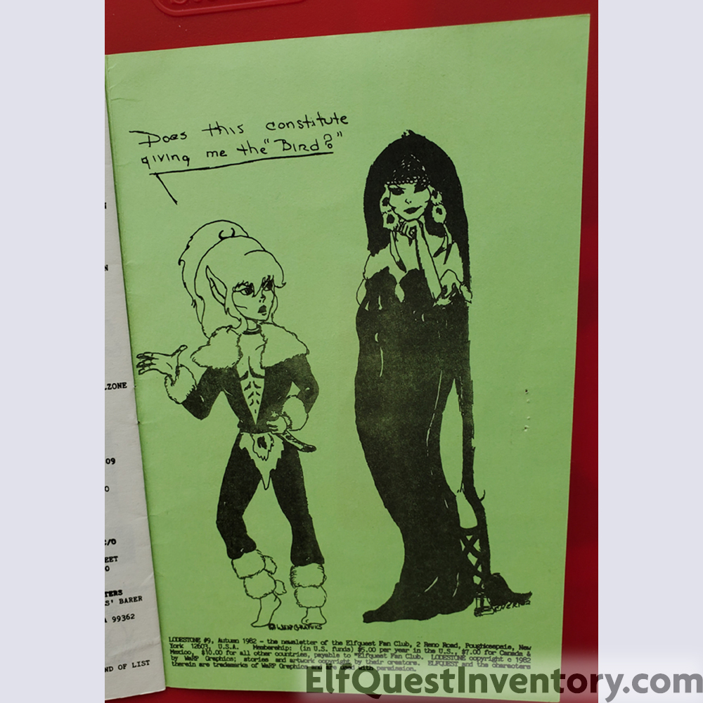 Elfquest Lodestone issue 9. Cover art by Linda Medley. The inside front cover indicates this was for Autumn 1982. The inside back cover is drawn by Cheri Johnson. Page 2 has a Troll recipe drawn by Michael Allen.
