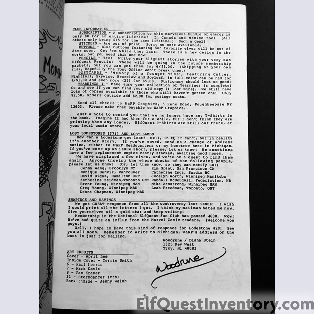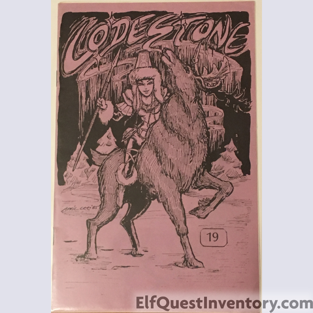 Elfquest Lodestone issue 19. Cover by April Lee. Contains fan art and writing, a holt listing, and character sketches by Wendy Pini.