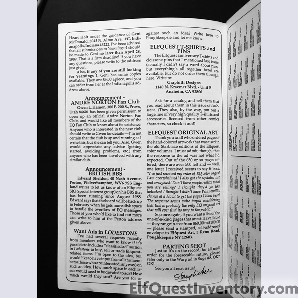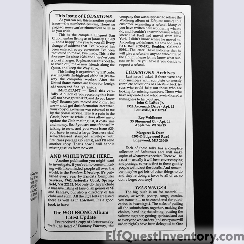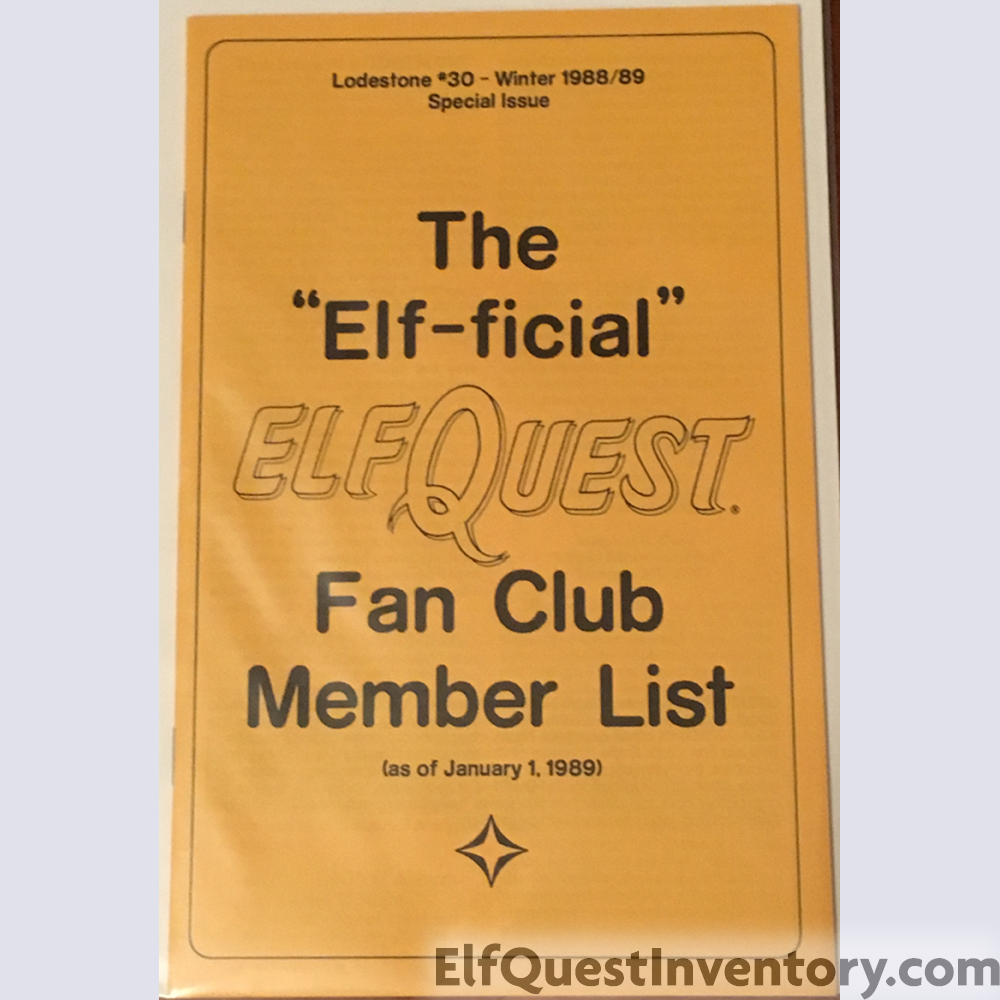 Elf Quest Lodestone issue 30 contains a complete list of all members of the fan club as of January 1, 1989. Interestingly enough, the list is not in alphabetical order by last name, nor is it in alphabetical order by state. Members are listed in descending order by zip code. Most likely it was part of how the mailing list program was written, as to receive bulk mailing prices items must be sorted by zip code.