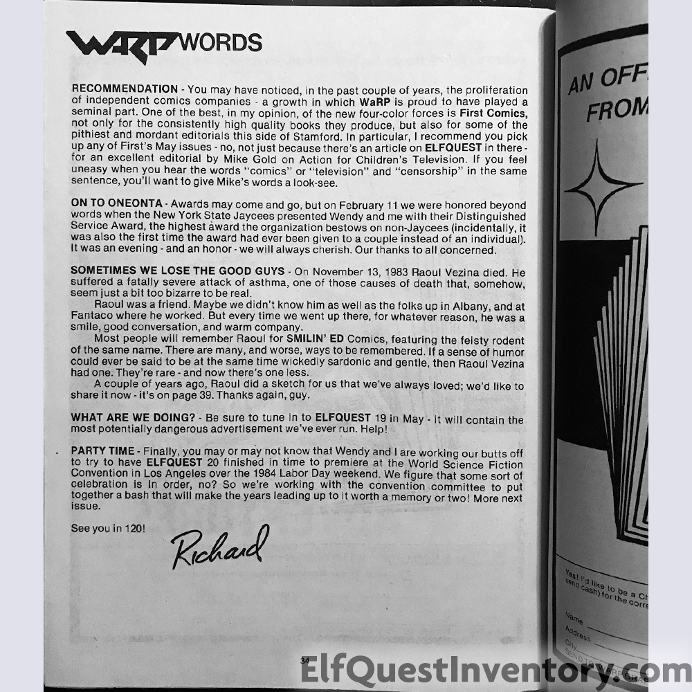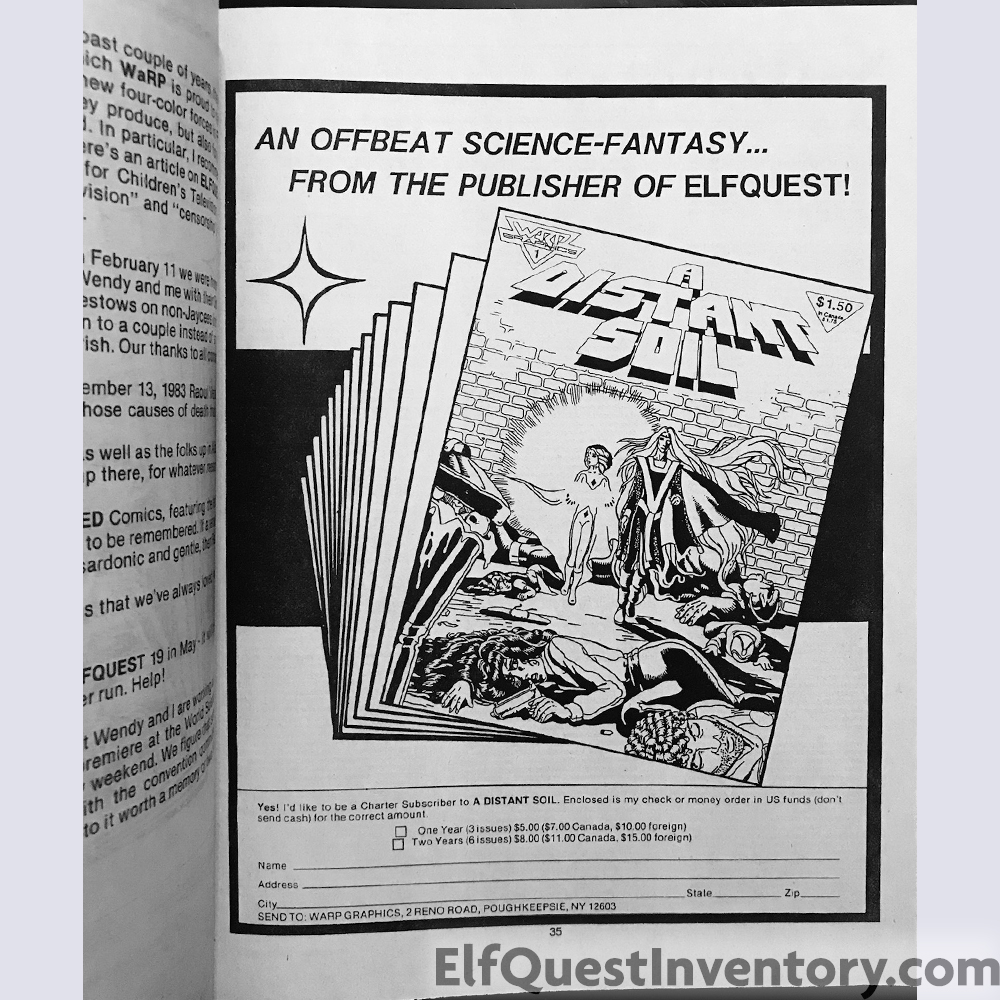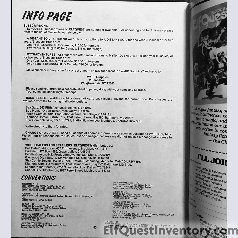 Ad for Myth Adventures, Ad for A Distant Soil, EdQuest, convention list, an add for the Donning Starblaze book 3 in both softcover and limited edition hardcover with slipcase