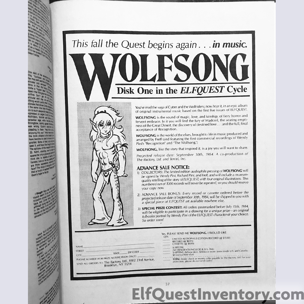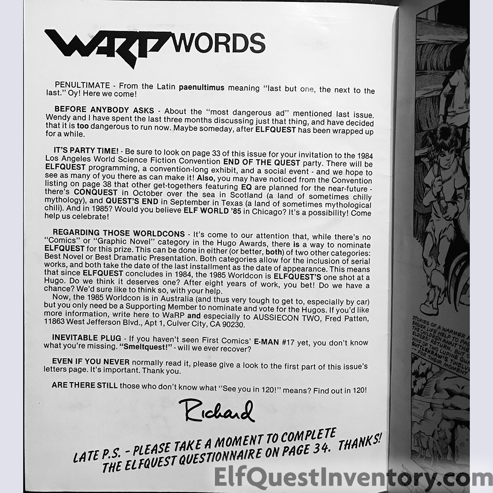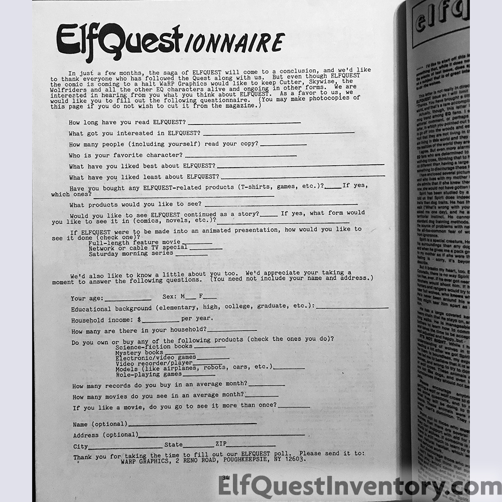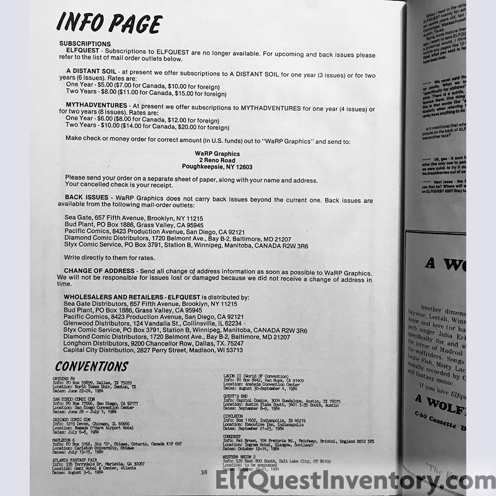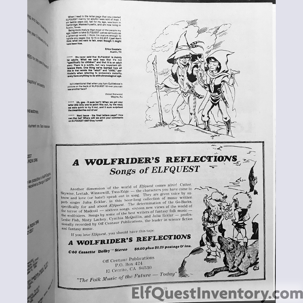 Announcement of ElfQuest 20 and End of the Quest celebration at the 42nd World Science-Fiction Convention, ElfQuestionnaire, letters, Wolfsong Disk 1 ad, conventions, ad for Wolfrider's Reflections cassette tape from Off Centaur Productions, ad for Dalgoda from Fantagraphics Books, ad for ElfQuest Rollplaying game