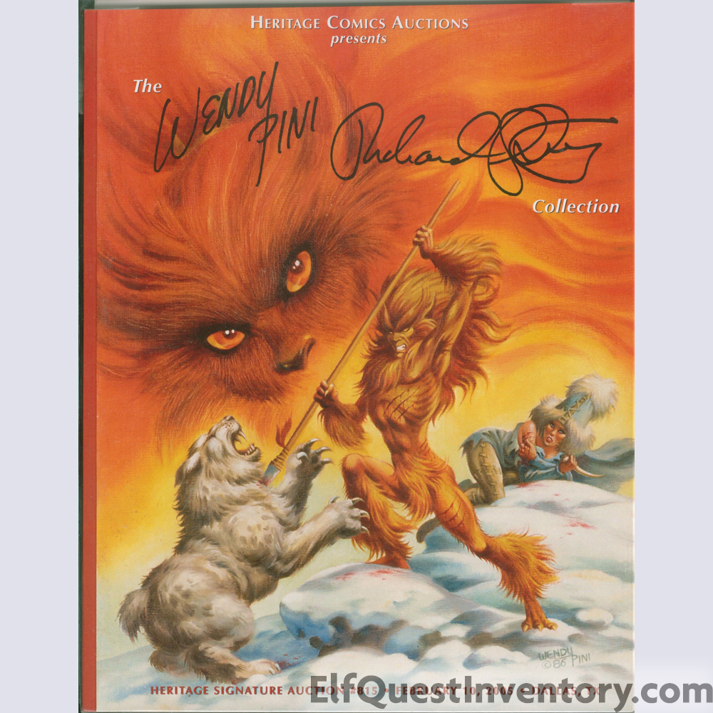 | Heritage Signature Auction catalog, February 10, 2005, Dallas, Texas. In 2005 the Pinis commissioned Heritage Auction Company to sell a large number of original artworks. The collection included Wendy's pre-ElfQuest work, ElfQuest art and comic covers, paintings, work done for other comic titles, "Nightwatch" a 1975 painting by Richard Pini, and work by other artists that were owned by the Pini's. The catalog features the 1986 oil painting of Timmorn Yellow Eyes used on the cover of the first Blood of Ten Chiefs anthology. The cover also includes black printed signatures from Wendy and Richard Pini. This book is often sold as "autographed" however, the signatures are not originals unless there happens to be a second set. |