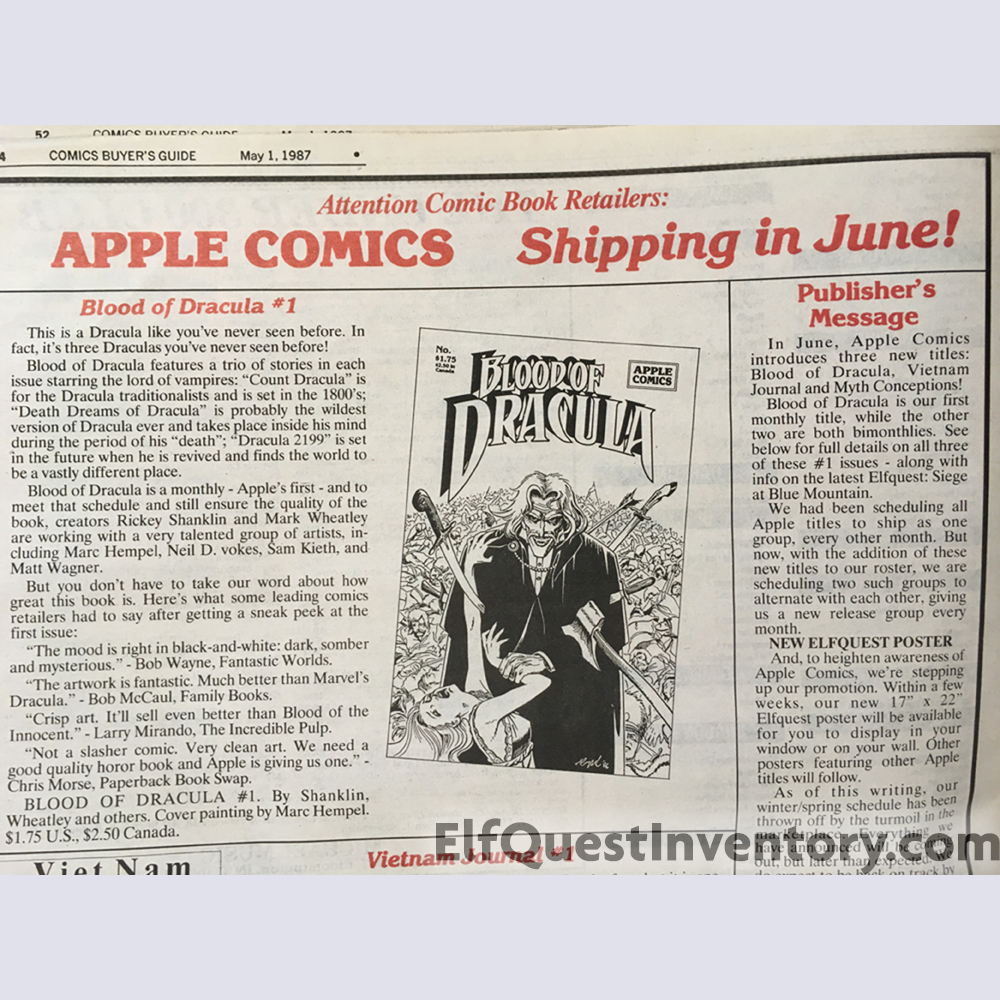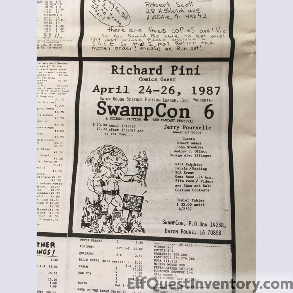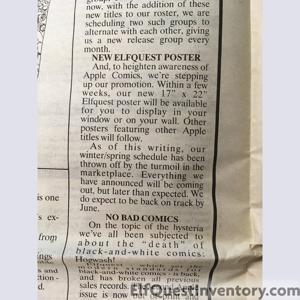 Apple Comics ad pushing Seige at Blue Mountain 5 noting that issue 2 sold out in three weeks and retailers should get extra stock! Also annoucing an Apple Comics Elfquest poster available. WaRP makes an appearance in a local comic shop. Announcement for Swamp Con 6 where Richard will be appearing.