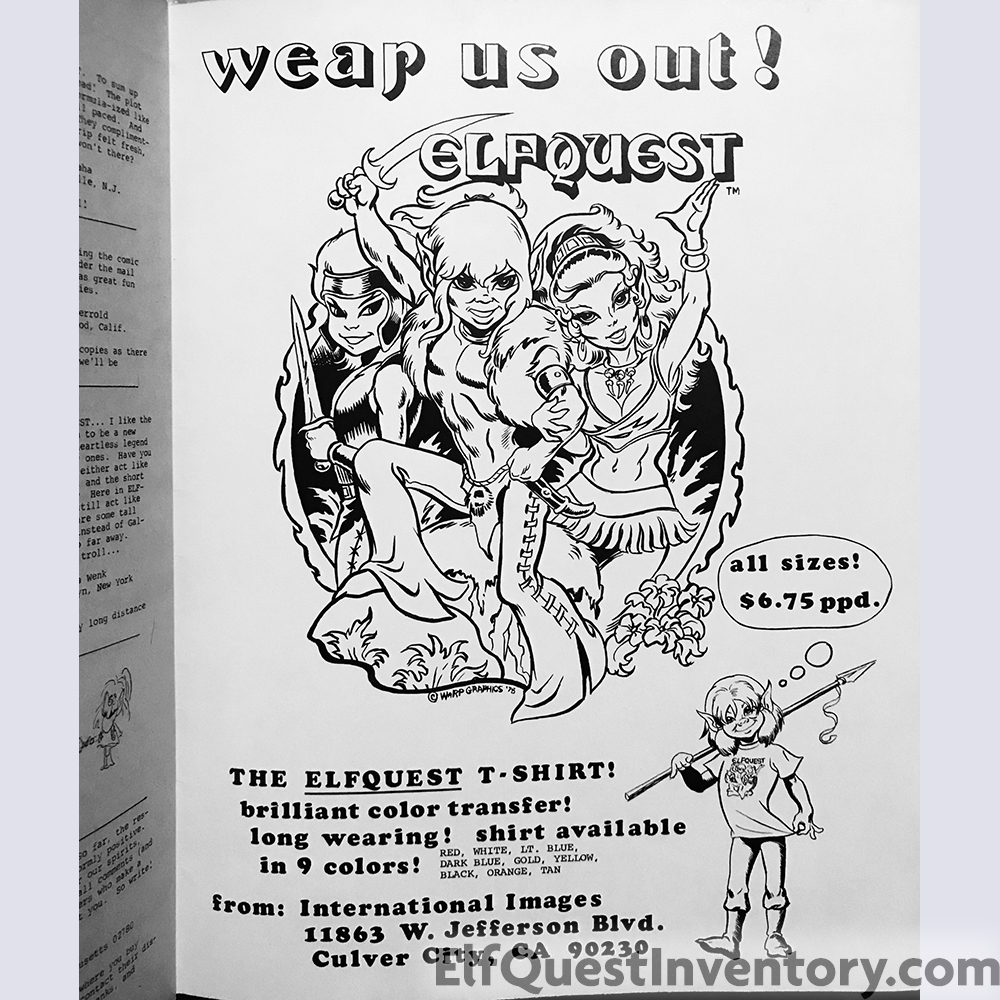Back cover illustration of Leetah. Inside back cover has advertisement for transfer t-shirt of the Trio (this endeavor would later become overwhelming as ElfQuest grew in popularity and the transfers were sold individually.) Contains two pages of fan letters.