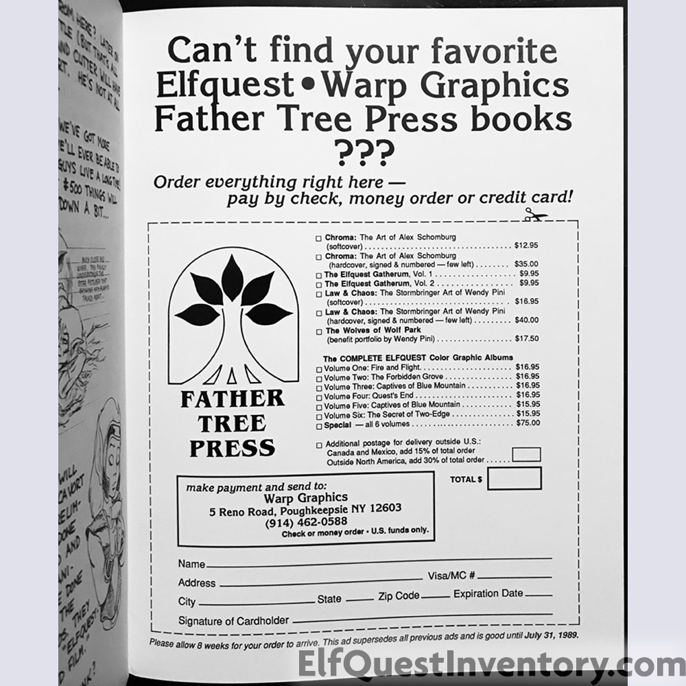 Back cover illustration of Cutter. There are no advertisements in the first three printings. The last four pages are concept sketches of the elves. Inside back cover of first three editions is a black and white version of the Fantasy Quarterly #1 cover, inside back cover of fourth edition is an ad for Father Tree Press books.