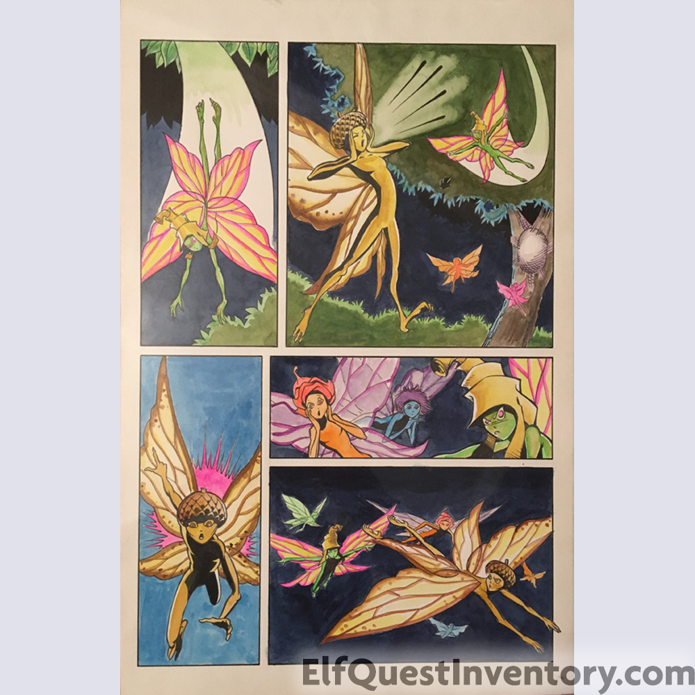 This is the original page 9 that Bill Neville drew then it was colored for the comic Blood of Ten Chiefs 20. Petalwing and Nutbonnet talking about something tearing open their wrapstuff. All art completed on a single page.