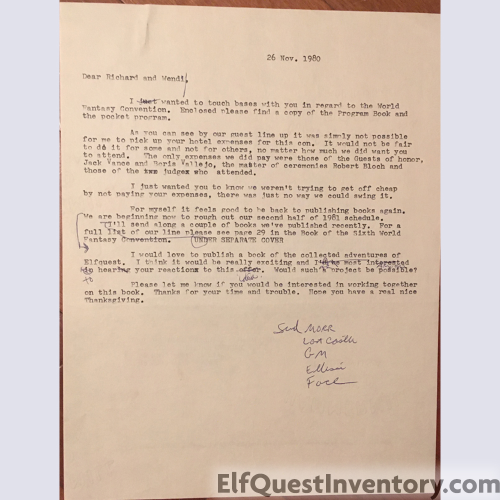 Fax from Chuck Miller to Richard and "Wendi" Pini explaining why he wouldn't be able to cover WaRP's expenses to the World Fantasy Convention due to the fact that there had already been expenses paid out for Guests of Honor and the Master of Ceremonies as well as judges invited. He then goes on to say that he would love to publish a collected Elfquest in novel form and that the public would love it as well!
