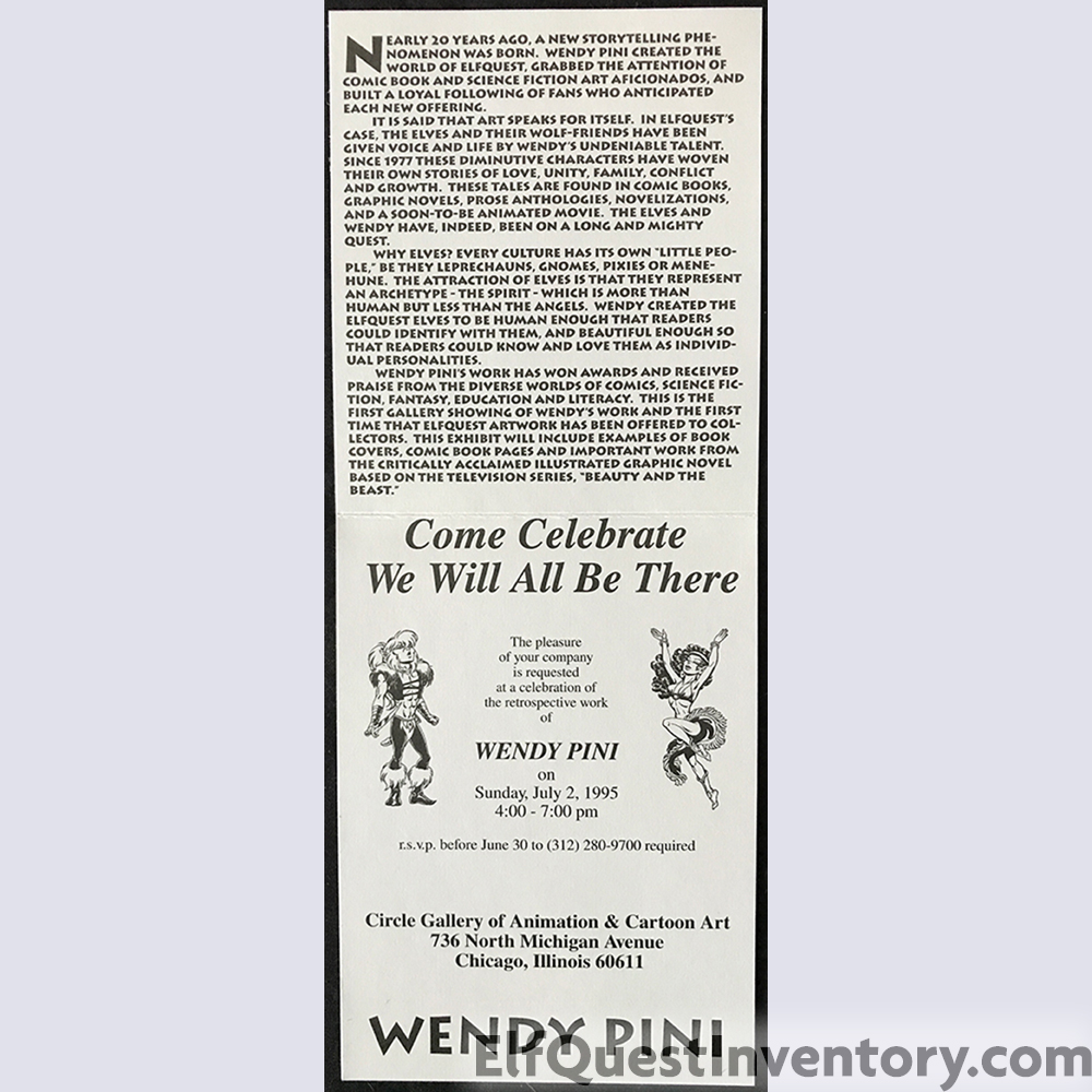 Invitation to the opening at the Circle Gallery of Animation & Cartoon Art, Retrospective work of Wendy Pini, held on July 2, 1995.