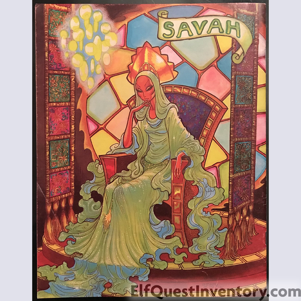 Back cover color illustration of Savah. First printing has two ads on the inside back cover, one for the t-shirt with the Trio transfer on it, and one for the ElfQuest Hologram Pendant. Price is in black in a white circle with a black border.