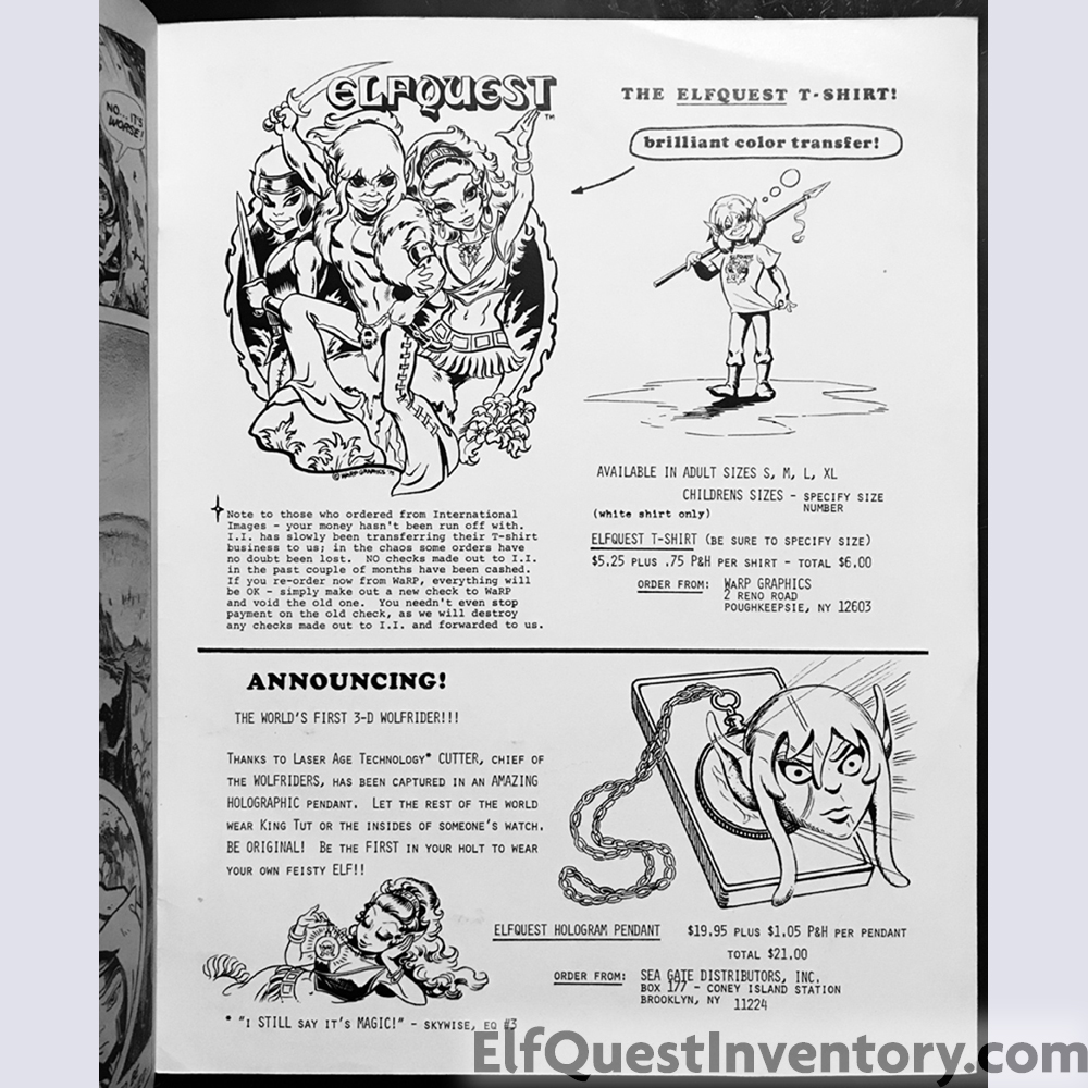 ElfQuestInventory.com is not affiliated with Warp Graphics, it is a fan site created with the goal of cataloging ElfQuest merchandise that has been made across the globe. Many, if not most, of the items are not currently available, and may be one of a kind. If you see something you would like to add to your inventory, please add it to your want list here, or check your local comic shop, ebay, amazon, or other online resources. Warp Graphics has a Shop page with links to help you on your hunt. They also have an ebay store.