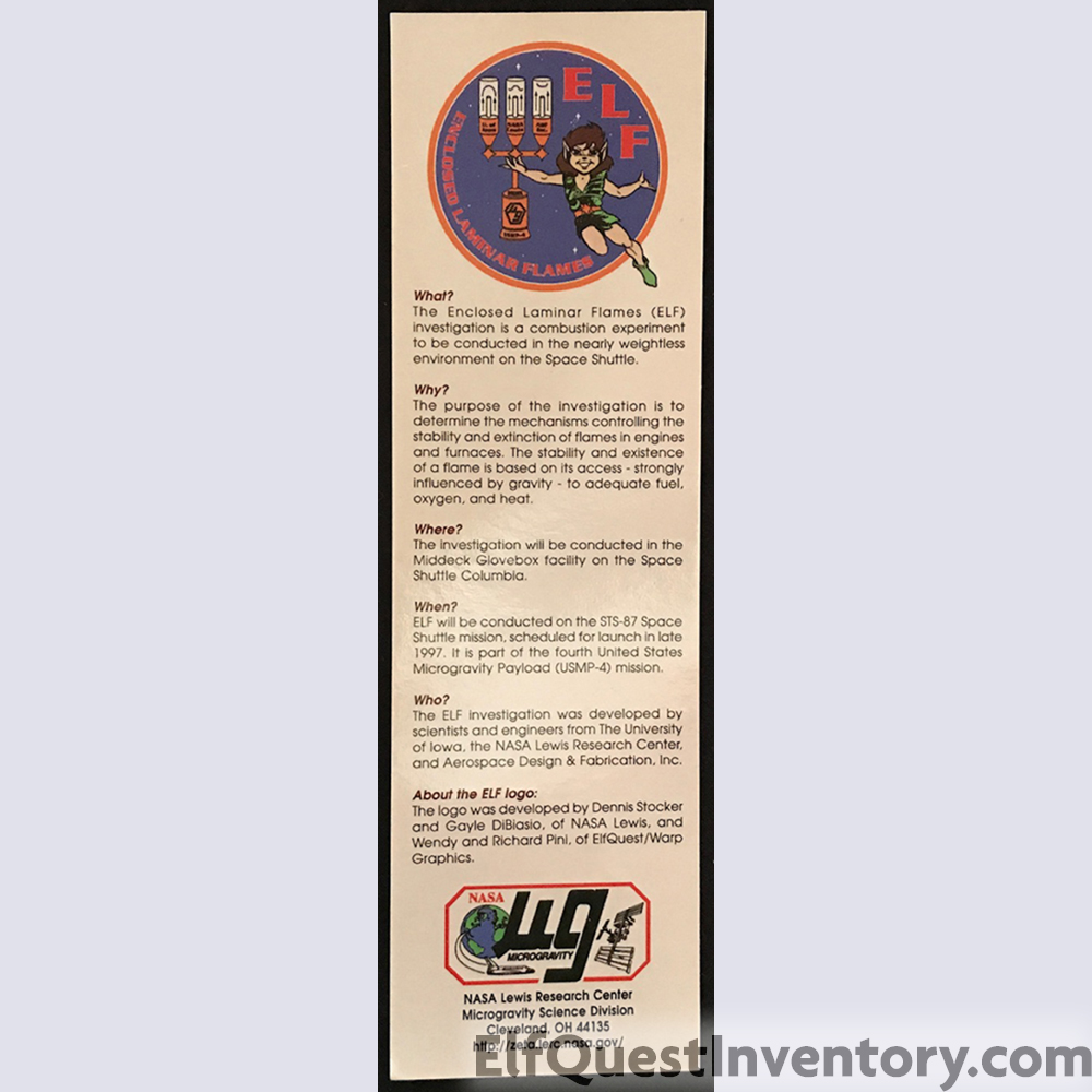 | The ELF logo was produced for NASA for the STS-87/USMP-4 Space Shuttle mission, November to December 1997. From a post on FaceBook by Richard Pini: This all began when I received an email, on August 15, 1996, from Dennis Stocker at the NASA Lewis Research Center in Cleveland, Ohio. The subject line was "A proposal from NASA." (Which, if you know me at all, immediately grabbed my attention.) The message read, in part, "I would very much like your assistance in designing a logo for a Space Shuttle investigation named ELF, for Enclosed Laminar Flames. I named the experiment ELF, partly due to my enjoyment of mythology and fantasy literature. Therefore, the use of an elf in the logo seems more than natural. Now, I happen to also read and collect comic books, and have enjoyed your "Elfquest" books. With that in mind, I can think of no one better than you to develop the logo for the ELF investigation." |