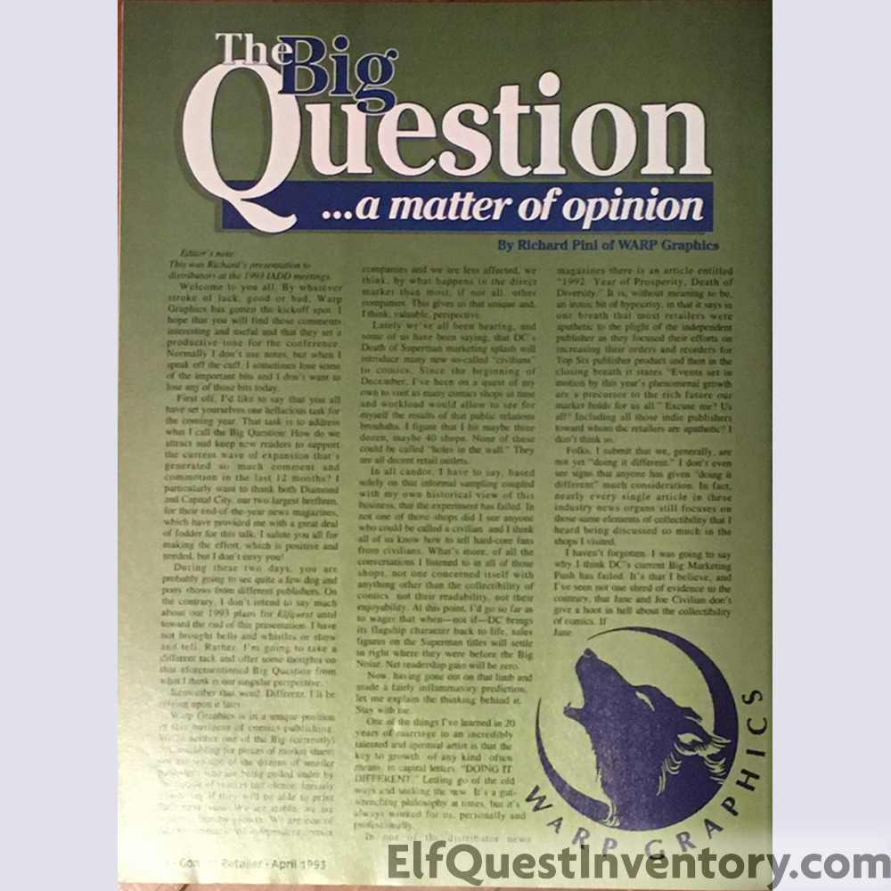 ElfQuestInventory.com is not affiliated with Warp Graphics, it is a fan site created with the goal of cataloging ElfQuest merchandise that has been made across the globe. Many, if not most, of the items are not currently available, and may be one of a kind. If you see something you would like to add to your inventory, please add it to your want list here, or check your local comic shop, ebay, amazon, or other online resources. Warp Graphics has a Shop page with links to help you on your hunt. They also have an ebay store.