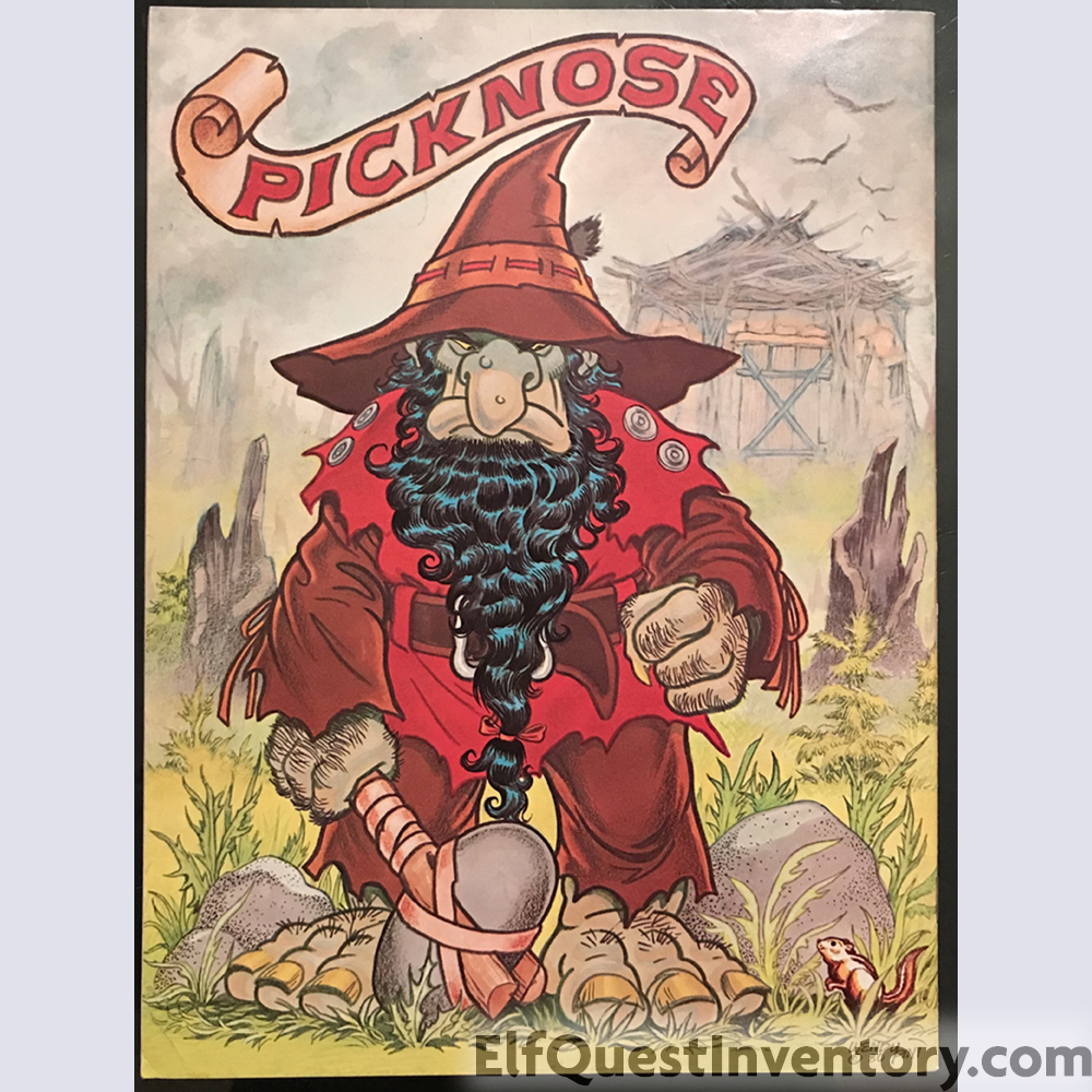 Back cover color illustration of Picknose. First printing has ElfQuest on dark rust background and a blank inside back cover. Price is in black on white cover background. Contains fan letters, an ad for the pewter Cutter and Leetah figurines, additional comics by Wendy Pini, fan art, ElfQuestions (a sort of EQ FAQ) and the announcement for the ElfQuest Fan Club. Second printing first page indicia is the same as the first printing.