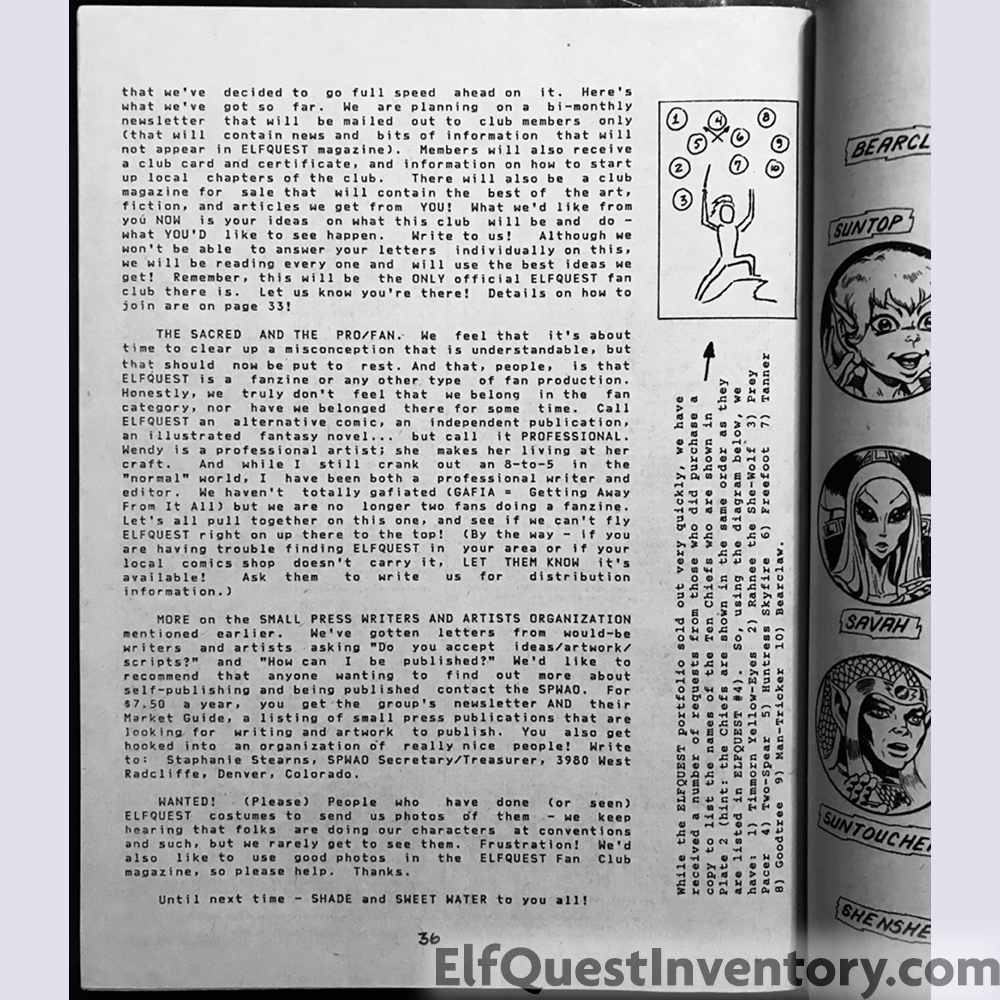 First Printing has a cover price of $1.25 Second printing - $1.25 Third printing - $1.50Back cover color illustration of Ember, choplicker, Suntop, Wing, Dart, and Newstar. All printings have ElfQuest without a solid background and the price is in white. Inside back cover has an ad for the Cutter and Leetah three inch pewter figures from Perth Pewter. Contains fan letters, the Fan Club announcement, Who's Who part two, music, and an additional comic by Wendy Pini.